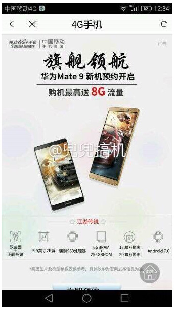 На просторах Weibo, китайского аналога Twitter, обнаружились очередные подробности о готовящемся к выпуску смартфоне Huawei Mate 9. На этот раз было опубликовано изображение, якобы представляющее собой промо-страницу оператора China Mobile, посвященную запуску новинки.