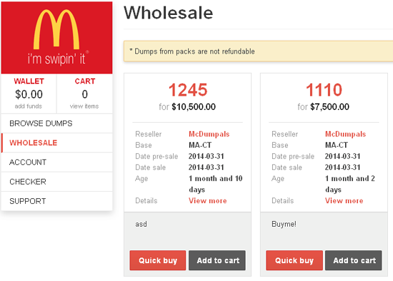 Существуют сотни подпольных интернет-магазинов, продающих карты. Один из самых известных — McDumpals (да, магазин косит под сеть фастфудов, играя на ассоциации со скоростью обслуживания), о котором недавно рассказывал Кребс. Стремясь обеспечить собственную безопасность, магазин пускает не всех, а только по вступительному взносу в 100 долларов. Как и остальные платежи, вступительный взнос можно заплатить только в биткоинах.
