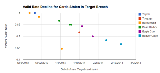 Карты, украденные в ходе атаки на Target, продавались несколькими последовательными партиями, каждая из которых постепенно дешевела из-за падающего процента валидности. Как видно из графика, даже спустя два месяца после «слива» базы карт свыше половины из них были работоспособными — по крайней мере, так их рекламировали продавцы.