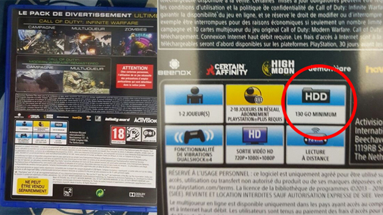 Один из геймеров сфотографировал заднюю обложку коробки издания Call of Duty: Infinite Warfare Legacy Edition для PlayStation 4. На обложке игры из французского магазина Micromania указывается, что для игры потребуется, как минимум, 130 Гб свободного места. Отмечается, что 130 Гб потребуется для установки и новой игры и переиздания Call of Duty: Modern Warfare. Однако даже при этом размеры нового шутера остаются одними из самых больших по современным меркам.