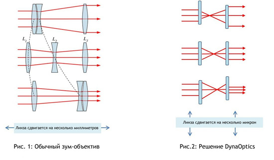 Если в стандартных объективах линзы, чтобы приблизить объект, движутся по одной оси, из-за чего объектив выдвигается. В разработке DynaOptics ассиметричные линзы приближают или удаляют изображение, двигаясь относительно друг друга в разных направлениях, но в одной плоскости.