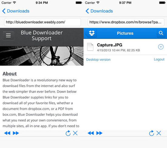 Изначально программа вышла в App Store с ограниченным числом торрент-ресурсов, одобренных Apple. Blue Downloader мог загружать файлы с трекеров вроде Archive.org, Linuxtracker и Bitlove, а с более популярных ресурсов The Pirate Bay или KickassTorrents загрузки были запрещены. В последнем обновлении Харрисон добавил поиск torrent-файлов через Google, так что возможности по загрузке из глобальной сети самого разнообразного контента стали заметно более широкими. Однако такой вариант развития событий Apple не устроил и буквально в течение нескольких часов торрент-клиент был заблокирован.