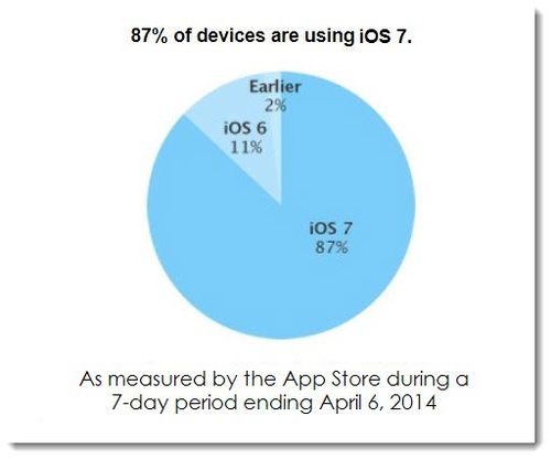 Одной из основных причин любви разработчиков к платформе iOS являются высокие темпы обновления операционной системы пользователями, по этому показателю программному обеспечению Apple до сих пор нет равных. Данные рекламного агентства Chitika наглядно демонстрируют, что спустя семь месяцев после запуска версии, iOS 7 используется уже на 87% устройств, в то время как у основного конкурента Android наблюдается большое число активно используемых версий.