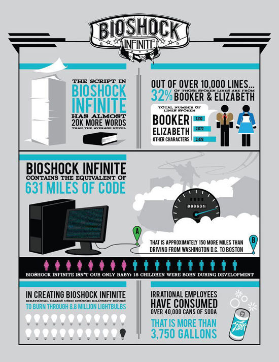 Завтра, 26 марта, состоится релиз игры BioShock Infinite. Незадолго до этого события разработчики из Irrational Games опубликовали в своем Twitter инфографику, демонстрирующую некоторые интересные факты о проекте. Оказалось, например, что его сценарий содержит на 20 тыс. слов больше, чем среднестатистический роман.