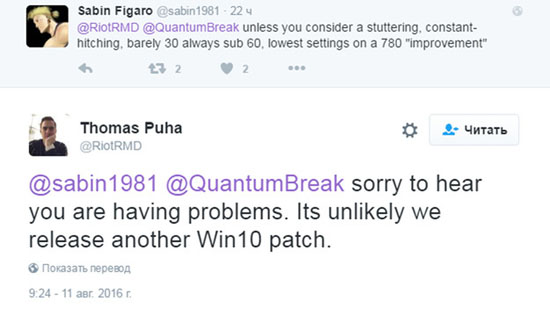Когда разработчика упрекнули в отсутствии поддержки версии игры для магазина Windows, он отметил, что они уже сделали патч для DX12-версии Quantum Break в начале июля 2016 года. «Крайне маловероятно, что мы выпустим еще одно обновление. Прошу прощения, если вы все еще испытываете проблемы с версией игры для Windows 10, — отметил сотрудник Remedy. Мы не занимаемся бизнес-решениями. Мы разрабатываем игры».