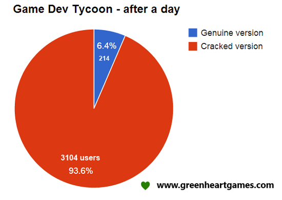 Разработчики говорят, что смотреть на такие отзывы игроков без слёз было невозможно. Они с сожалением приводят график распространения лицензионных и нелицензионных копий Game Dev Tycoon, на которую они потратили год работы. Статистика собирается анонимно через интернет, в крякнутой и лицензионной версии указаны разные ID, так что их можно отличить друг от друга.