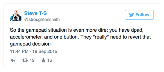 «Ситуация с геймпадом еще хуже, чем ожидалось: у вас есть D-Pad, акселерометр и одна кнопки. Им действительно нужно пересмотреть свое решение на счет геймпада», – написал в своем твиттере Тронто-Смит. По его словам, Apple напрасно запретила разработчикам выпускать игры для Apple TV, которые не могут обойтись стандартным пультом Apple.