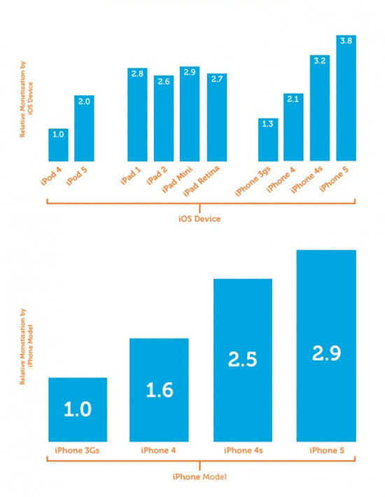 Для этого они сравнили различные поколения iPhone и Android, которые имеют разные разрешения экрана. В итоге оказалось, что чем выше разрешение дисплея, тем больше внутриигровых покупок совершают пользователи. Владельцы гаджетов с топовыми экранами приобретают в 9,9 раз больше виртуальных предметов, чем те, мобильник которых имеет низкое разрешение. Пользователи iPhone 5 покупают в 3,8 раза чаще, чем те, кто имеет iPhone 3GS. Такая же зависимость от качества экрана прослеживается и среди владельцев iPod. Те, кто имеет iPod 5, в два раза чаще покупают виртуальные предметы, чем пользователи iPod 4. А вот сравнение разных поколений планшетов не выявило зависимости внутриигровых покупок от разрешения экрана.