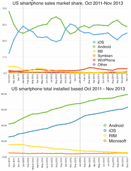 Guardian на днях опубликовал очень информативные графики, которые демонстрируют разницу между базой активируемых устройств с реальной рыночной долей платформ iOS и Android на рынке США.