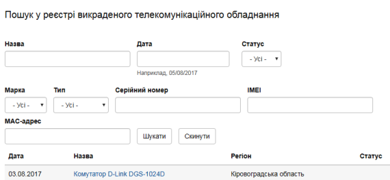 "Интернет Ассоциация Украины (ИнАУ) в тестовом режиме ввела в строй реестр похищенного телекоммуникационного оборудования http://inau.org.ua/equipment. Пользование реестром добровольно. Если у Вас было похищено телекоммуникационное оборудование, заполните данные о нем в реестре. А перед приобретением оборудования, проверьте, пожалуйста, нет ли его среди списка похищенных у другого оператора.
