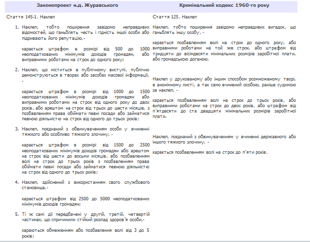 Депутат предлагает дополнить Уголовный кодекс Украины статьями 145-1 «Клевета» и ст. 145-2 «Обида», которые являются расширенными версиями статей 125, 126 Уголовного кодекса 1960 года. Проектом устанавливается, что распространитель заведомо ложных сведений, порочащих честь и достоинство другого лица или подрывающих его репутацию должен понести наказание в виде штрафа 8500-17000 грн. Или же в виде исправительных работ на срок до 1 года.
