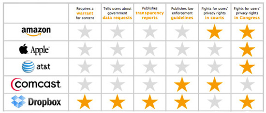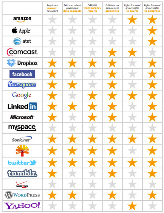 Всего в данной оценке участвовало 16 компаний, связанных с интернет-услугами. Каждая звездочка соответствовала одному из критериев, по которому оценивалась та или иная компания. Среди критериев оценки, например, были следующие: «Борется за права приватности пользователей в суде», «Сообщает пользователям о требованиях государства к информации», «Публикует «прозрачные» отчеты» и т.д.