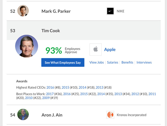 В прошлом году рейтинг доверия Тиму Куку составлял 96% Двумя годами ранее в отчёте Glassdoor показатель доверия был 94%. В 2011-м, в первый год на данном посту, Кук удерживал верхнюю строчку с рангом в 97%. Бывший глава Стив Джобс занимал лидирующую позицию в течение периода 2010-2011 гг. с рангом 95%.