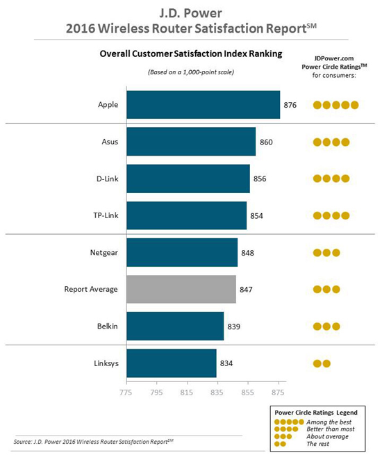Известная исследовательская компания J.D. Power решила провести опрос на предмет степени удовлетворенности среди пользователей роутеров разных брендов. В рейтинге, составленном аналитиками, продукты из серии AirPort уверенно лидируют с 876 баллами, в то время как лидеры рынка D-Link, ASUS, TP-Link и Netgear оказались позади.