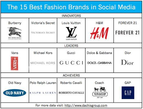 В Топ-15 самых популярных модных брендов в соцсетях также вошли: Vans, Michael Kors, Gucci, Dolce & Gabbana, Dior, Old Navy, Polo Ralph Lauren, Roberto Cavalli, Coach и Gap.