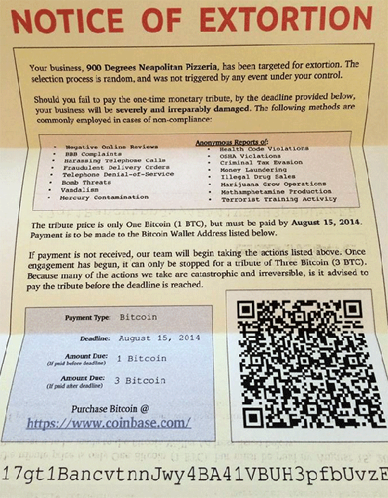 Пиццерию предупреждают, что если она не заплатит 1 BTC до 15 августа, то размер дани увеличится до 3 BTC. Мошенники заботливо объясняют, каким образом зарегистрироваться на сайте Coinbase и куда перевести деньги. «Что за хрень этот биткоин?», — недоумевает владелец ресторана 900 Degrees Neapolitan Pizzeria на своей страничке Facebook.