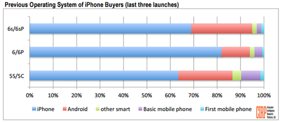 Помнишь, как Тим Кук хвастался массовым переходом Android пользователей на iPhone 6 и iPhone 6 Plus. Так вот, с выходом новых моделей с приставкой s число "перебежчиков" только увеличилось. Отчет исследовательской компании Consumer Intelligence Research Partners сообщает о том, что в первый месяц продаж iPhone 6s, новинку приобрело рекордное, по сравнению с прошлыми моделям, количество бывших пользователей Android.