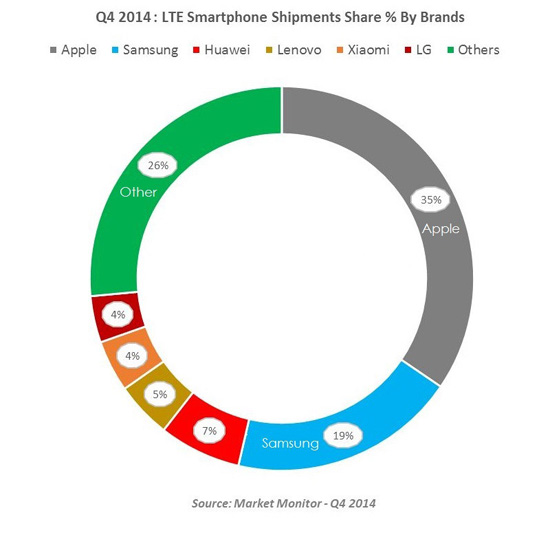 За три месяца с момента дебюта флагманских смартфонов iPhone 6 и iPhone 6 Plus, пользующихся феноменальной популярностью, Apple удалось захватить 35% рынка LTE-устройств, сообщает Counterpoint. Компания из Купертино опередила по этому показателю южнокорейскую Samsung, которая по итогам IV квартала 2014 года довольствовалась меньше 20% рынка.