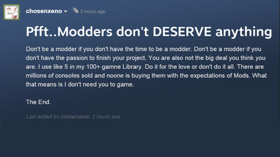 В сети стали появляться многочисленные отзывы геймеров, недовольные сложившейся ситуацией. Одни сетуют на то, что другие не рассмотрели положительный эффект от появления платформы в Steam, другие говорят, что теперь им придется отказаться от занятия моддингом.