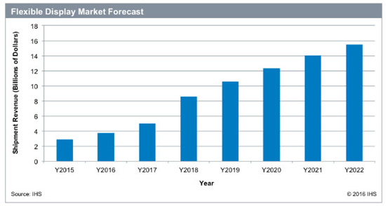 По прогнозу IHS, объем рынка гибких дисплеев в денежном выражении в этом году составит 3,7 млрд долларов, а в 2022 году он достигнет 15,5 млрд долларов.
