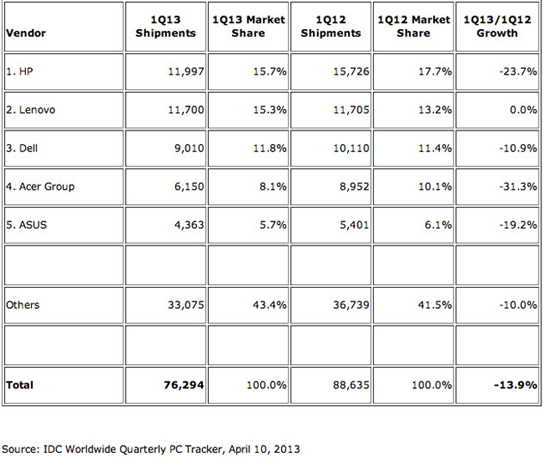 Два крупнейший исследователя компьютерного рынка, компании IDC и Gartner, сегодня подвели итоги деятельности компьютерного рынка в первом квартале 2013 года. Обе компании говорят об ужасающем падении продаж персональных компьютеров, обе компании видят тому примерно один и тот же набор факторов: переход пользователей на планшеты и ноутбуки, а также слабые продажи Windows 8.