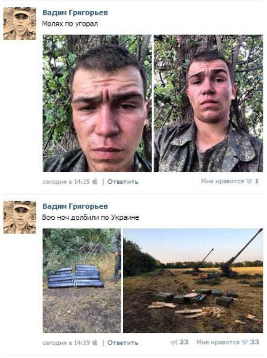Російський солдат Вадим Григор’єв розмістив у соцмережі фото з артилерією, якою він обстрілює Україну. Ще один написав у мережі, що його підрозділ "стоїть на кордоні України"