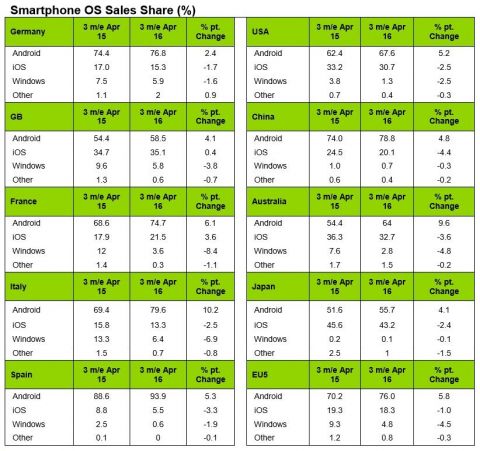 Последние статистические данные от компании Kantar за трёхмесячный период до апреля показывает продолжение уменьшения рыночной доли платформы iOS. Android растёт, но более медленными чем прежде темпами, так что разрыв между двумя главными мобильными платформами увеличивается.
