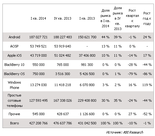 Согласно ABI Research, в I квартале 2014 г. на мировой рынок было поставлено 427,2 млн мобильных телефонов всех типов, что на 1% меньше в сравнении с аналогичным периодом прошлого года и на 10% меньше в сравнении с IV кварталом 2013 г.