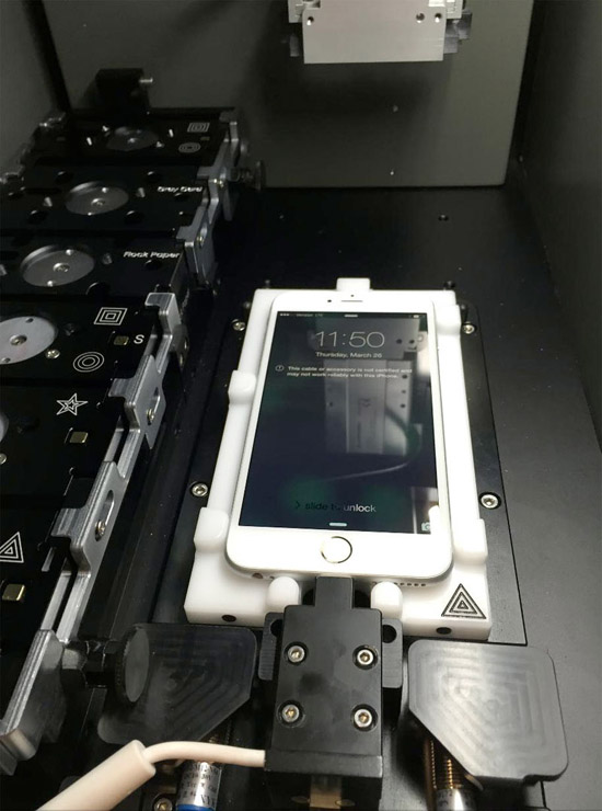 Даже сейчас о «Машине для калибровки iPhone» известно немногое. Устройство позволяет калибровать камеру и дисплей смартфона, а также подсоединять к старому устройству новый сканер отпечатков пальцев. В этом и заключается особенность ремонта в авторизованном сервисном центре: если вы обращаетесь за починкой дисплея, вам заменят всю фронтальную панель, включая домашнюю кнопку со встроенным датчиком.