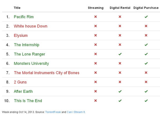 На сайте обновляется список из десяти самых популярных пиратских фильмов за последнюю неделю. В таком списке нет ничего удивительного — подобные рейтинги ведутся давно и являются самым объективным показателем популярности картины. Но на этом сайте для каждого фильма указаны еще несколько параметров: существует ли официальная видеотрансляция фильма, есть ли возможность цифровой аренды по времени или на один просмотр, существует ли вообще возможность купить лицензионный фильм в цифровом виде?