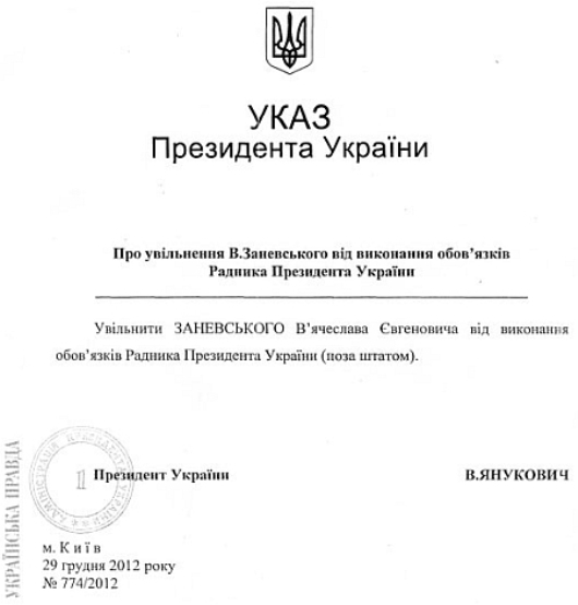 На запрос журналиста в АП - с просьбой предоставить отсканированную копию указа об отставке Заневского - был предоставлен указ об увольнении главного охранника, который вышел 29 декабря 2012 под номером 774.