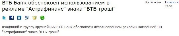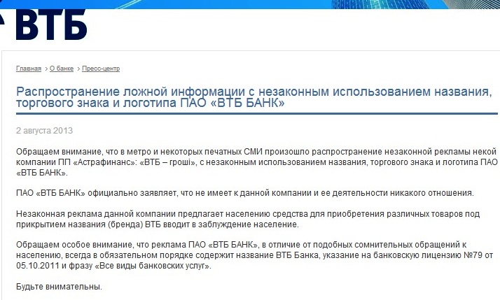 На початку цього місяця українські ЗМІ сколихнуло повідомлення про те, що компанією «Астрафинанс» у власній рекламі був незаконно використаний бренд «ВТБ БАНКу». Таким чином, громадяни могли спостерігати поширені в пресі та метро повідомлення про послугу «ВТБ - гроші», підсвідомо ототожнюючи її з відомим брендом. А умови надання кредиту безсумнівно вабили: понад 40 000 грн. всього лише під 4%, без застави й довідки про доходи. Стурбований правопорушенням «ВТБ БАНК» оприлюднив свою позицію, заперечивши будь-яке відношення до цієї реклами.