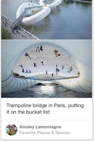 Чаще всего в постах о путешествиях пользователи Pinterest публикуют фотографии моста-батута «Trampoline Bridge» в Париже. На снимках изображен большой футуристический мост через Сену. Согласно изображениям, он состоит из трех огромных батутов и расположен недалеко от Эйфелевой башни.