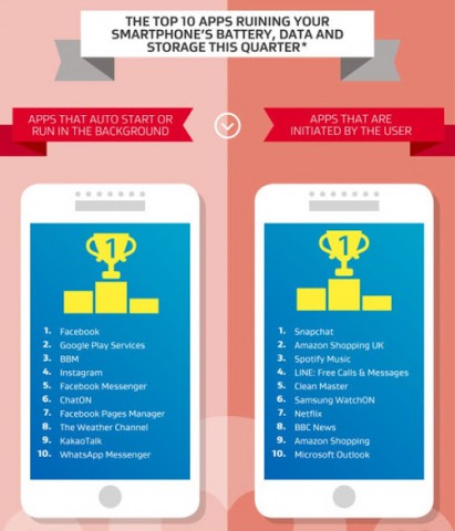 -ухудшающие производительность самозапускающиеся приложения: Facebook, Google Play Services, BBM, Instagram, Messenger, ChatOn, Facebook Pages Manager, Weather Channel, KakaoTalk, WhatsApp Messenger;