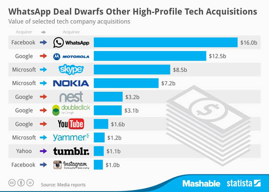 Mashable при помощи Statista составил график, на котором наглядно показаны самые затратные приобретения крупных хайтек-компаний за последние годы. Охотнее других на стартапы тратит деньги Google, но 16 миллиардов долларов США, которые Facebook выложит за WhatsApp (или 19, если учитывать вознаграждение сотрудникам), это абсолютный рекорд.
