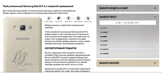 В прошлом году компания Samsung представила имиджевую линейку Galaxy A: изящные девайсы словно созданы для стильных молодых людей, а такие обычно ищут средства для самовыражения. Корейский гигант электроники идет навстречу, предлагая украсить памятной надписью и рисунком A3, A5 и A7.