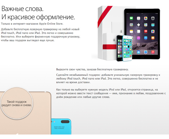 Поклонники Apple, вероятно, увидят в сервисе подражание корпорации из Купертино: в официальном интернет-магазине на корпус iPod или iPad можно бесплатно добавить лазерную гравировку. Но модифицировать таким образом iPhone нельзя.