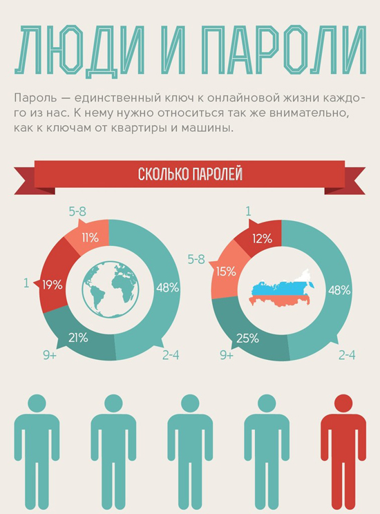 По результатам собственного опроса пользователей Facebook, российские пользователи оказались осмотрительнее остальных в отношении уникальности паролей. Лишь 12% русскоязычных респондентов ответили, что используют один пароль для нескольких учетных записей. В то же время в среднем по миру один и тот же пароль ко всем ресурсам использует каждый пятый пользователь. В США этот показатель еще выше — 23%. Самыми беспечными по результатам опроса оказались мексиканцы — 26% респондентов из Мексики признались, что используют один пароль при авторизации на всех ресурсах. В России бдительность пользователей значительно выше — такую беспечность проявляет лишь каждый десятый.