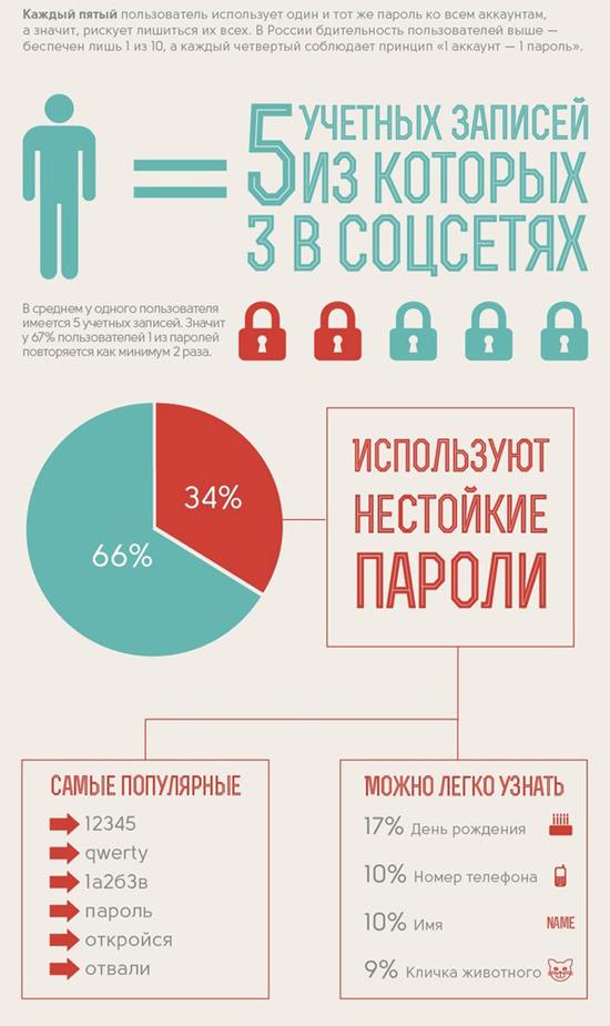 Зачастую не блещут оригинальностью и используемые в качестве паролей комбинации. Среди самых распространенных оказались собственная дата рождения, имя, номер телефона, последовательность цифр 123456 и даже клички домашних питомцев. Такие пароли можно подобрать за очень короткое время. Например, комбинации длиной 4-5 знаков сдаются злоумышленнику за считаные секунды. Кроме того, такую информацию часто можно найти на страничках пользователя в соцсети.