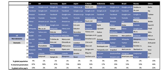 Крупнейшая финансовая компания Goldman Sachs опубликовала таблицу со статистикой самых популярных веб-ресурсов в зависимости от страны.