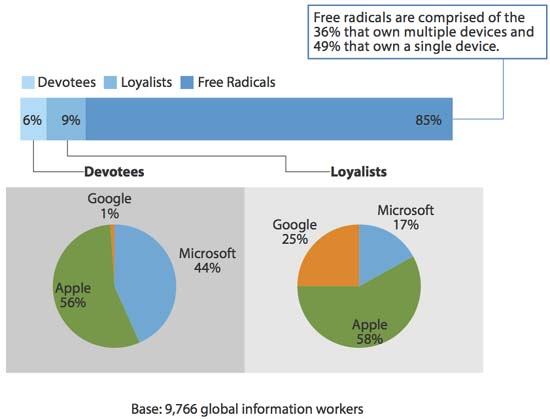 85% опрошенных были отнесены к неопределившимся, сторонниками и фанатами признаны 9% и 6%. При этом в двух последних категориях доминируют пользователи Apple. В международном масштабе Apple принадлежат 58% сторонников и 56% фанатов, в США перекос в пользу Apple еще значительнее: 59% и 71%.