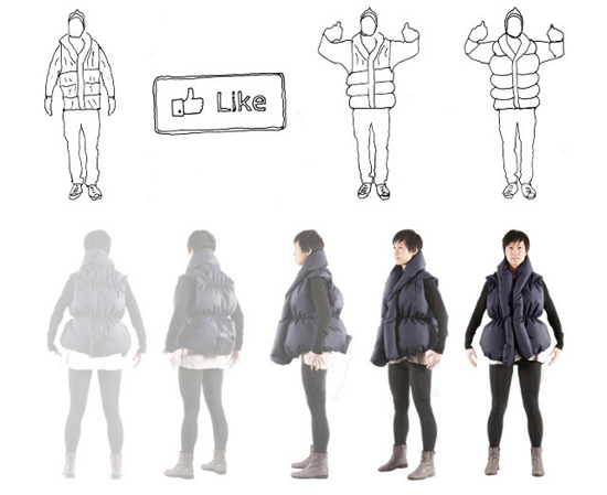 Этот надувной жилет подключается к аккаунту в Фейсбук и сдавливает пользователя, как только в его профиле появится новый лайк или комментарий: встроенный насос быстро накачивает верхнюю одежду воздухом, имитируя объятия. Сдавив жилет можно нанести «ответный удар» в виде лайка.