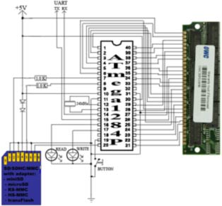 Это для меня проблемой не было. С SD карточками легко работать по SPI, и именно этот метод я и использовал. Карточка на 1 гигабайт работает нормально, но для Ubuntu Jaunty, может хватить и 512 мегабайт. У ATmega есть хардварный SPI модуль, и не составило трудов заставить карту работать. Довольно медленно — около 200 килобайт в секунду.