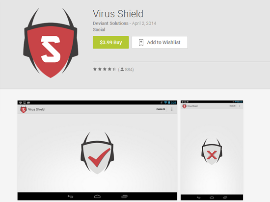 В описании Virus Shield, цена которого составляла 3,99 доллара, говорилось, что он предотвращает установку вредоносных приложений на смартфон, в режиме реального времени сканирует файлы и настройки, а также «защищает персональную информацию». Рейтинг «антивируса» держался на уровне 4,7 балла из пяти возможных.