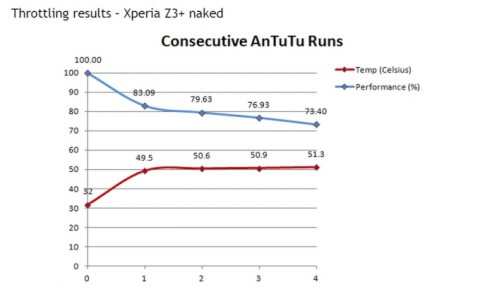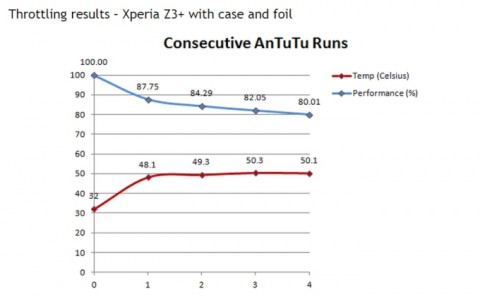 Для того чтобы убедиться в эффективности своего решения, пользователь провёл тестирование устройства в AnTuTu с вставленными алюминиевыми пластинами и без них и сравнил результаты. Итоги оказались не просто заметными, а даже очень значительными. После четырёх тестов без самодельного чехла производительность Xperia Z3+ снизилась до 73,4%, а с чехлом - до 80%.
