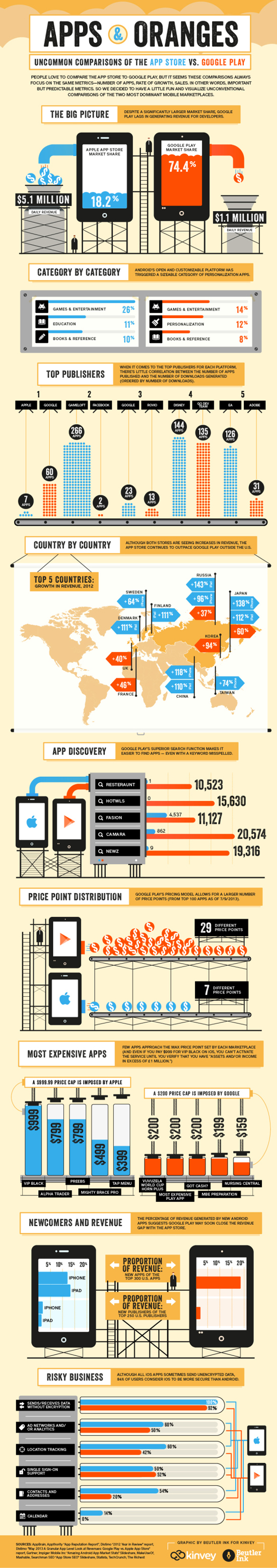 Сотрудники Kinvey и Beutler Ink решили составить сравнительную характеристику App Store и Google Play по не самым обычным показателям. Ниже приведены некоторые интересные выдержки из нее:
