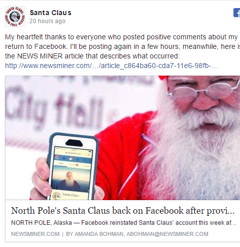 Санта Клаусу вернули его аккаунт в соцсети Facebook после того, как он предоставил документы, подтверждающие, что он действительно является Санта Клаусом. Об этом он написал на своей странице после возвращения.