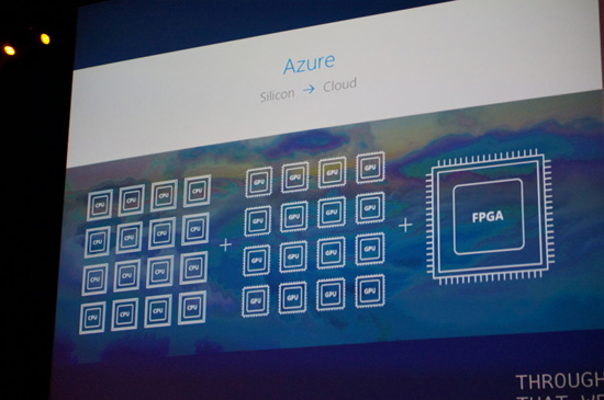 Системы машинного интеллекта Microsoft работают на базе облака Azure. Раньше вычисления на серверах компании производились с помощью видеоускорителей, которые в большинстве случаев оказывались более производительными и эффективными, чем обычные процессоры, а сейчас Microsoft перешла на использование FPGA — программируемых вентильных матриц на основе GPU. Облако Microsoft с FPGA-модулями Сатья Наделла назвал первым в мире суперкомпьютером, предназначенным специально для работы с искусственным интеллектом.