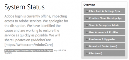 Опасения пользователей сполна оправдались вечером в среду 14 мая, когда система авторизации Creative Cloud перестала функционировать для части пользователей. В течение суток люди не могли авторизоваться через Adobe ID и запустить программы (InDesign, Photoshop и проч.). Судя по тысячам твитов от возмущённых пользователей, проверка лицензии происходит всё-таки чаще, чем один раз в 30 дней.