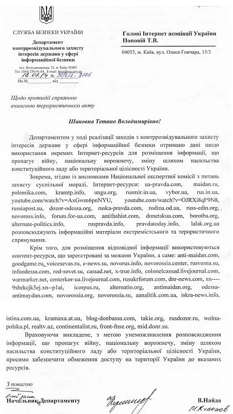 Служба безпеки України звернулася до Інтернет-асоціації України з проханням заблокувати сайти, які розміщують інформацію, що пропагує війну, національну ворожнечу, зміну шляхом насильства конституційного ладу або територіальної цілісності України.